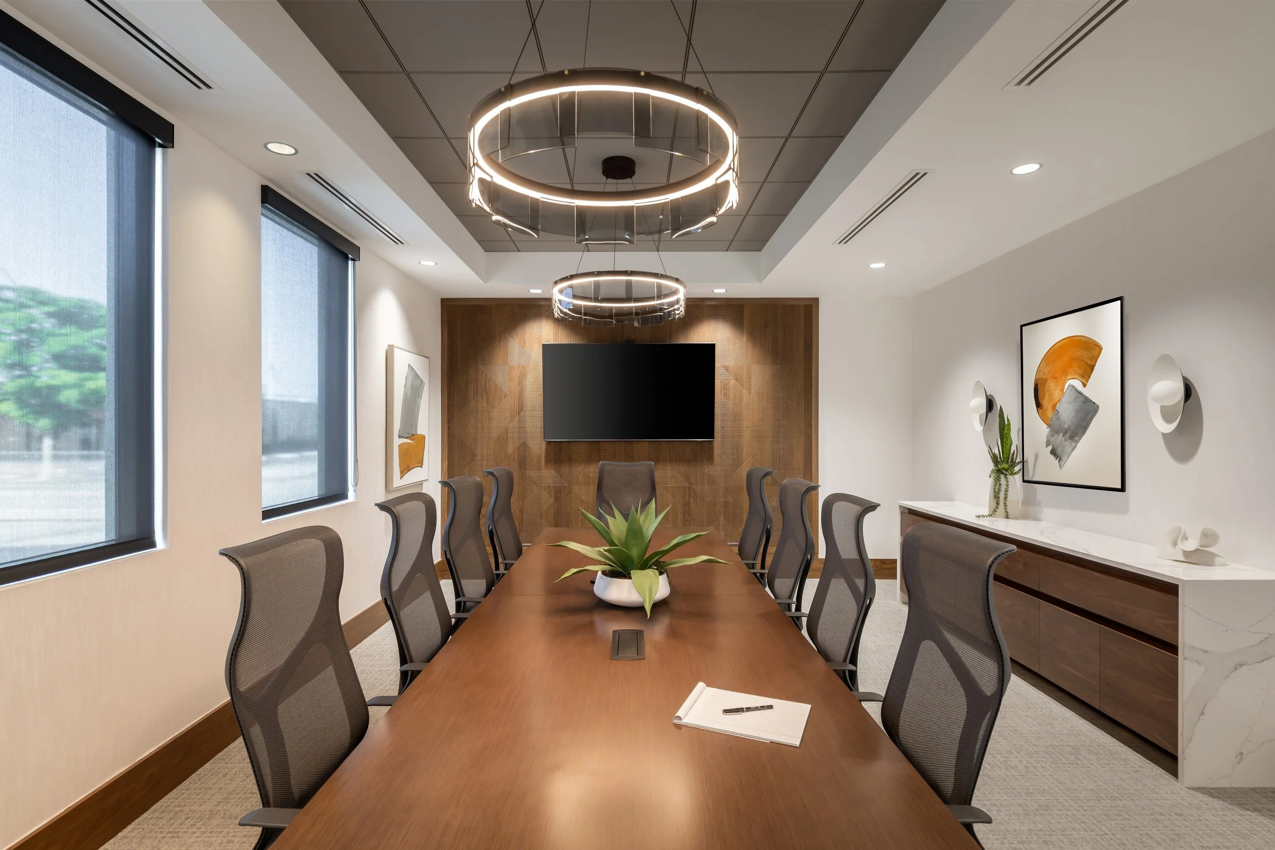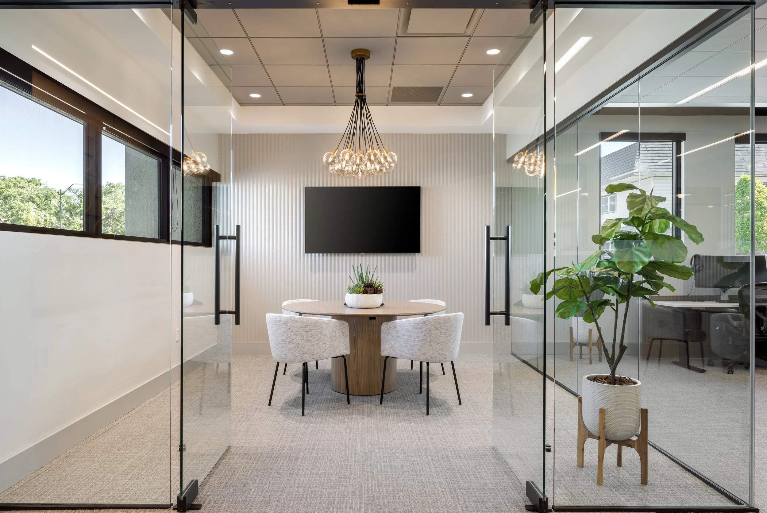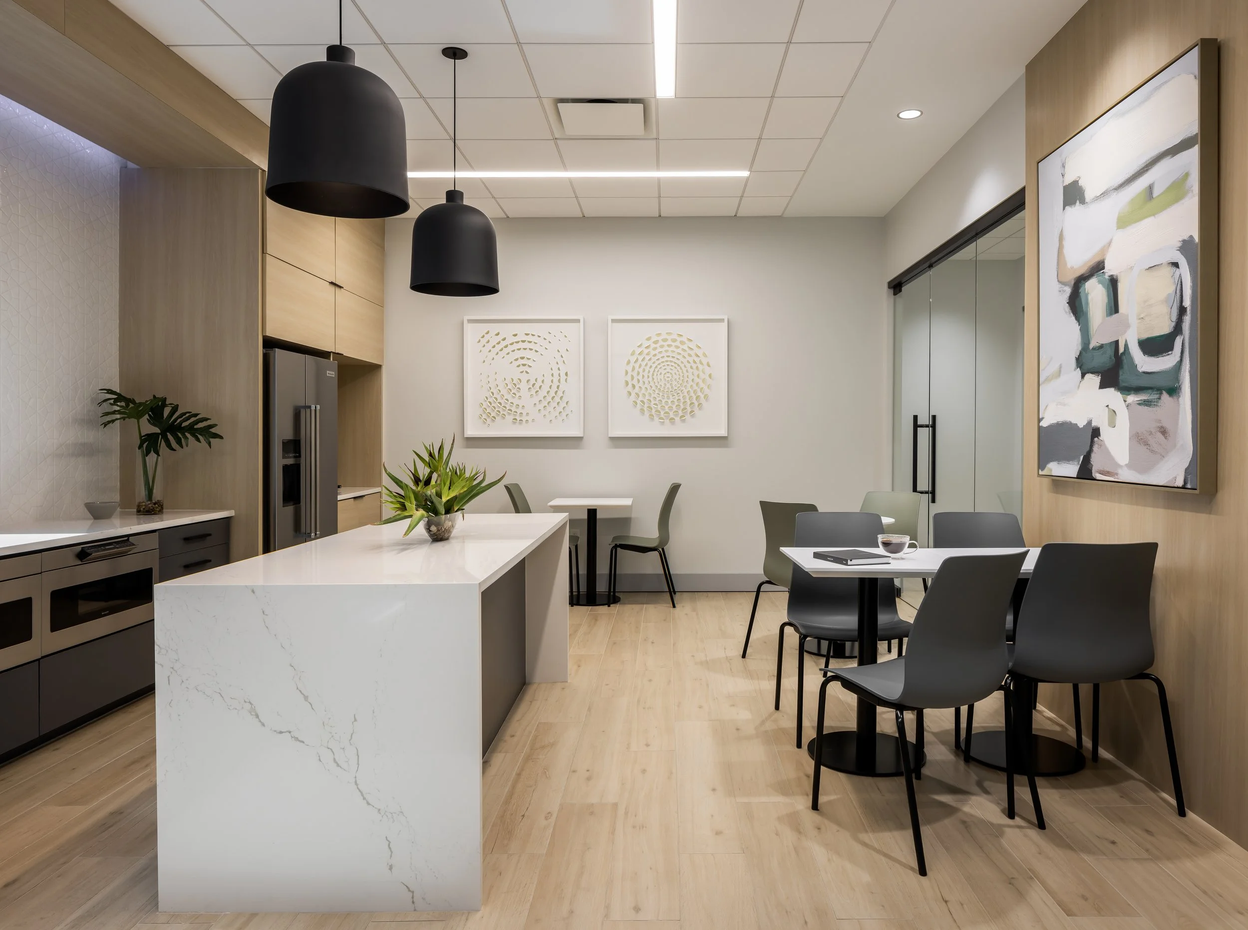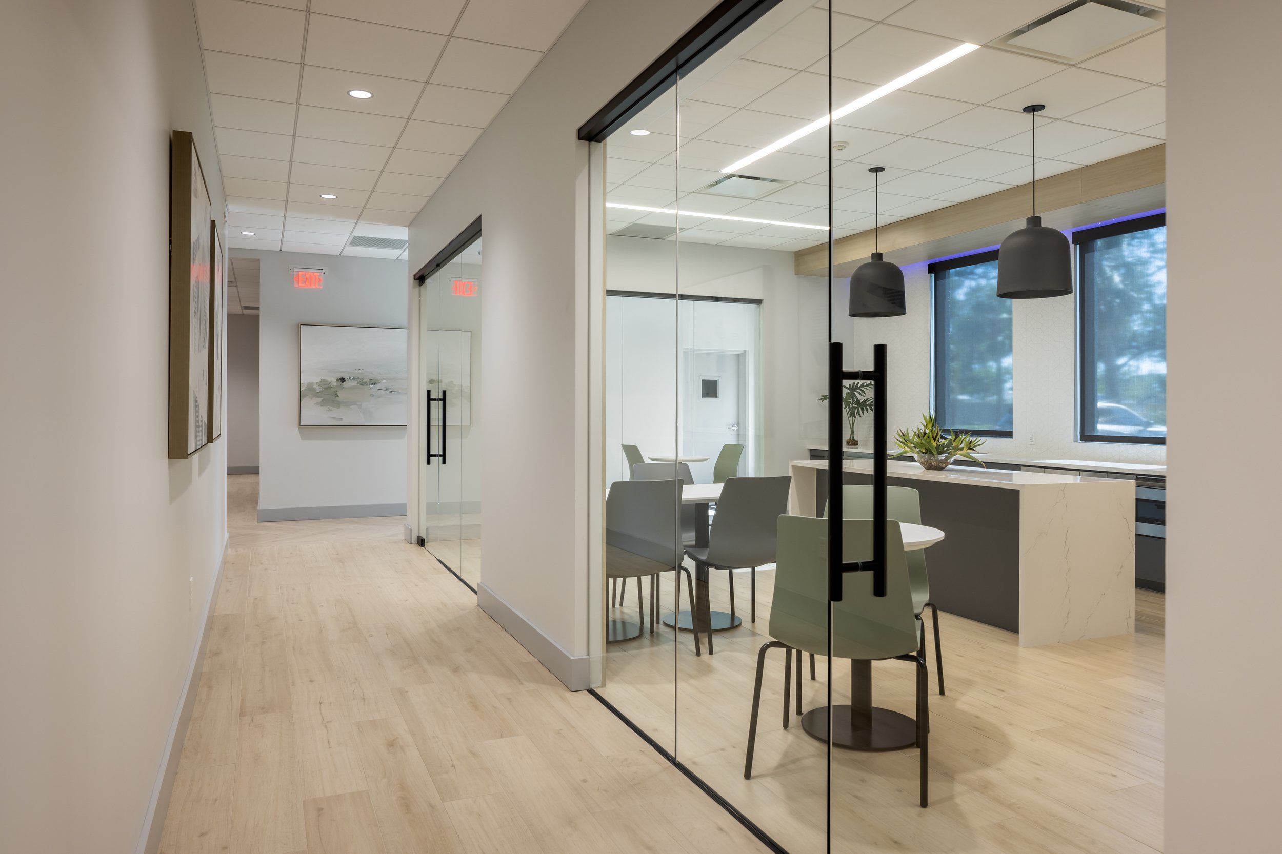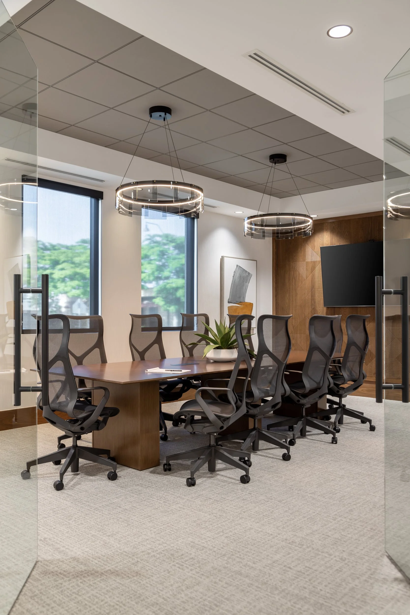 This office building balances modern sophistication with a welcoming atmosphere, defined by clean lines, warm finishes, and strategic use of natural light. Expansive windows and glass partitions enhance openness while maintaining a sense of privacy, allowing daylight to illuminate work and gathering spaces. Neutral tones are paired with rich wood accents and carefully selected furnishings to create an environment that feels both professional and comfortable. Integrated lighting, sleek built-ins, and subtle textures contribute to a polished, cohesive look that supports productivity while reflecting the brand’s contemporary character.